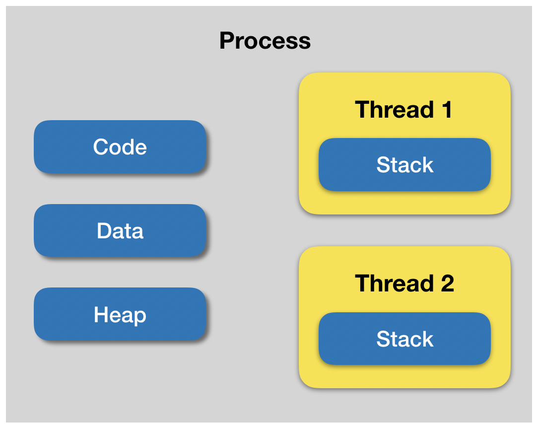 그림처럼 스레드는 Code, Data, Heap을 공유하지만 Stack영역은 각각 독립적으로 존재합니다.