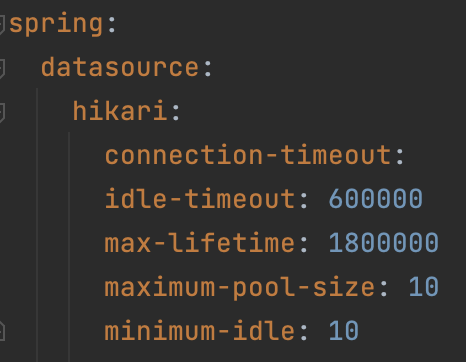 Connection pool에서 유지하는 최소한의 idle connection 수. default 값은 maximum-pool-size와 같다. maximum-pool-size 보다 큰 경우 maximum-pool-size보다 큰 값을 가질 수 없기 때문에 의미가 없는 값이 되어버리고, maximum-pool-size 보다 작은 경우에는 connection을 적게 유지하다가 늘어나는 경우 connection을 추가로 맺어야되기 때문에 maximum-pool-size와 같은 값을 설정하는 것이 성능상 좋다.