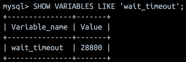 DB와 client가 연결 후 쿼리가 올 때까지 기다리는 시간이다. 연결을 맺은 후 어떠한 이유로 인해 application에서 연결이 반납이 되지 않고 connection만 연결되어 있는 상황이 생길 수 있다. 이때, 이러한 비정상적인 연결이 많아지면 실제 요청을 처리할 수 있는 연결이 줄어들기 때문에 특정 시간 동안 요청이 오지 않는 경우 연결을 끊게 된다. MySQL 8.0 버전 기준으로 default 값은 28800초 약 8시간이다